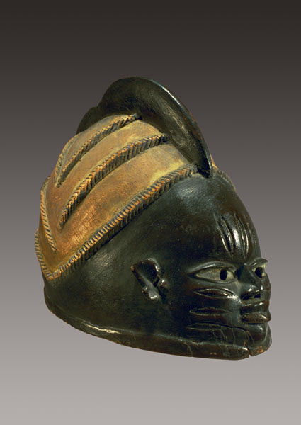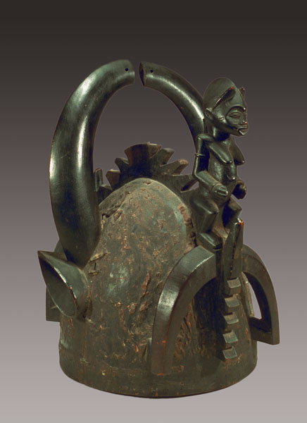 Casco di danza, Costa D'Avorio, altezza 34 cm, legno duro a patina nera brillante ricoperto con sostanze sacrificali (04.375)