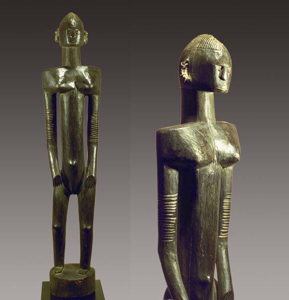 Figura femminile, Mali, altezza 101 cm, legno duro a patina nera, orecchini di alluminio, semi di Arbus Precatorius sugli occhi. (02.371)