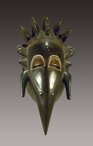Maschera di danza, Costa D'Avorio, altezza 40,5 cm, legno duro a patina nera brillante, residui di pittura bianca (04.32)